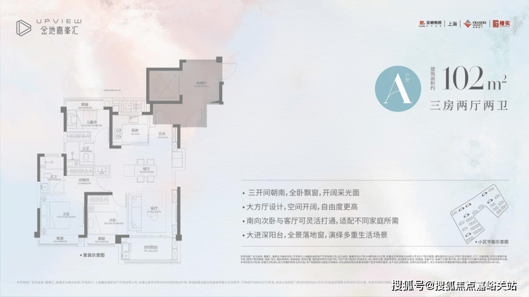 A户型是建面约102㎡3房2厅2卫,该户型三开间朝南,采光效果上佳。 大方厅设计,空间开阔自由度更高。南向次卧和客厅可灵活打通,适配不同家庭所需;大进深阳台+全景落地窗,让室内的通透性和视野可圈可点。