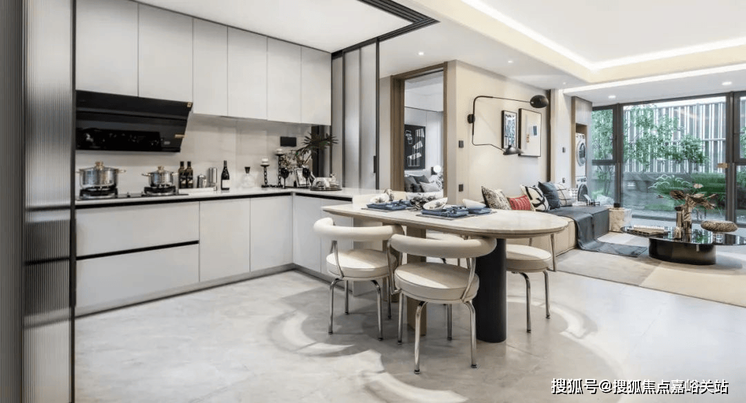 厨房移门采用大板砖厨房墙体、硅酸钙板厨房吊顶,定制金属移门+瓦楞玻璃,可根据需求自行开合,不仅引入更多光线,更增强了互动性。同时配备方太 (或同等档次品牌,以实际交付为准) 油烟机和灶台、洗碗机,以及凉霸。