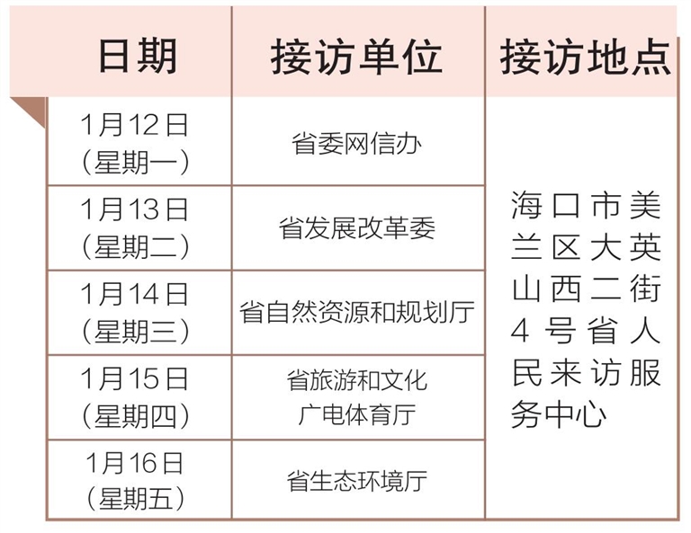1月12日至16日,省委网信办、省发展改革委、省自然资源和规划厅、省旅游和文化广电体育厅、省生态环境厅相关负责人将在海口市美兰区大英山西二街4号省人民来访服务中心接访群众。