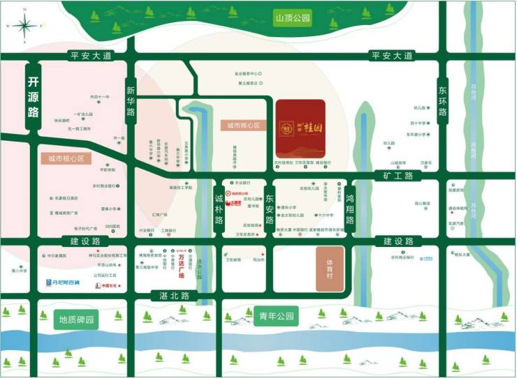 新景·桂园位于卫东区矿工路与东安路交汇处北200米路东,北邻平安大道,南接矿工路,西至东安路,三面环路。