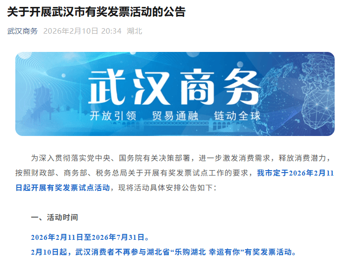 德信,德信体育,德信官方网站,德信体育官网注册,德信体育官网链接,德信体育app下载,德信体育官网,德信体育注册,德信体育网址,德信体育入口,德信体育靠谱吗,德信体育注册链接,德信官网,德信体育平台2月10日,据“武汉商务”微信公众号,武汉将于2026年2月11日-2026年7月31日开展有奖发票试点。消费者个人(自然人)在武汉市内实际经营,并向武汉市税务机关正常申报纳税的零售、餐饮、住宿、文化艺术、娱乐、旅游、体育、居民服务业等行业商户消费,取得符合条件的全面数字化电子普通发票后可参与活动。