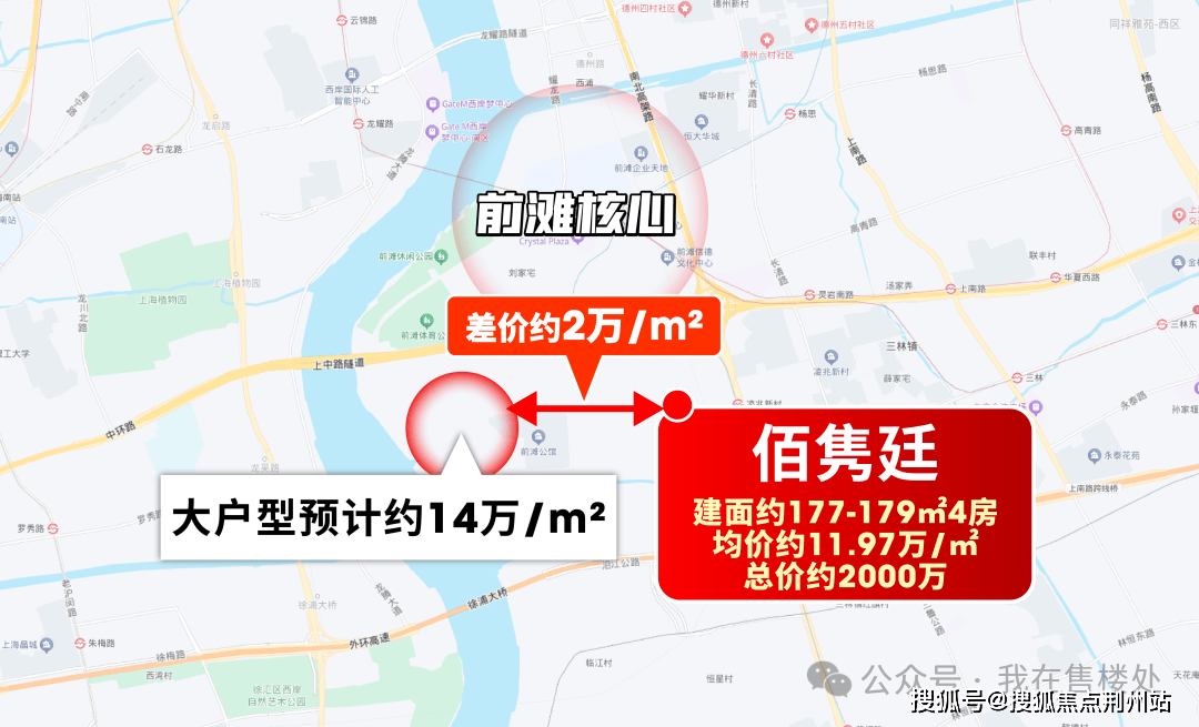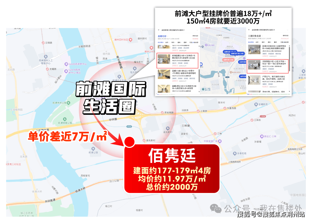 先看与前滩核心二手房的差距。前滩二手市场看似均价15-16 万/㎡,但这基本是小户型的水平;真正稀缺的大户型,成长性早已拉开差距,普遍站到18万+/㎡。像晶耀名邸 150+㎡4房,挂牌价超19万/㎡,总价直逼3000万;九宫格的三湘项目,挂牌价更是达19-25万/㎡的高位。